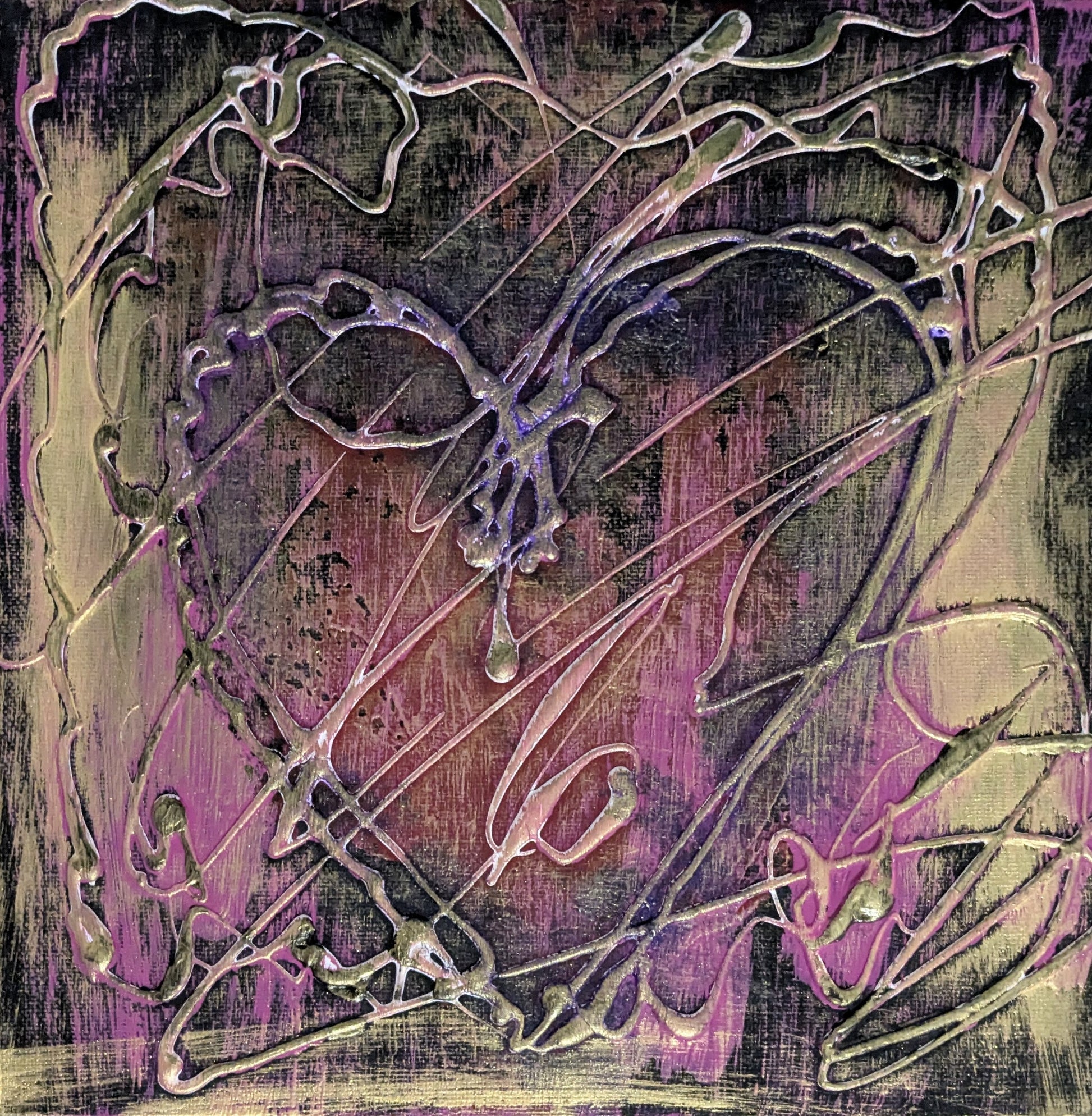 "Le coeur emmêlé" est une peinture acrylique abstraite originale, sur un carton entoilé au format 25x25cm (année 2025).