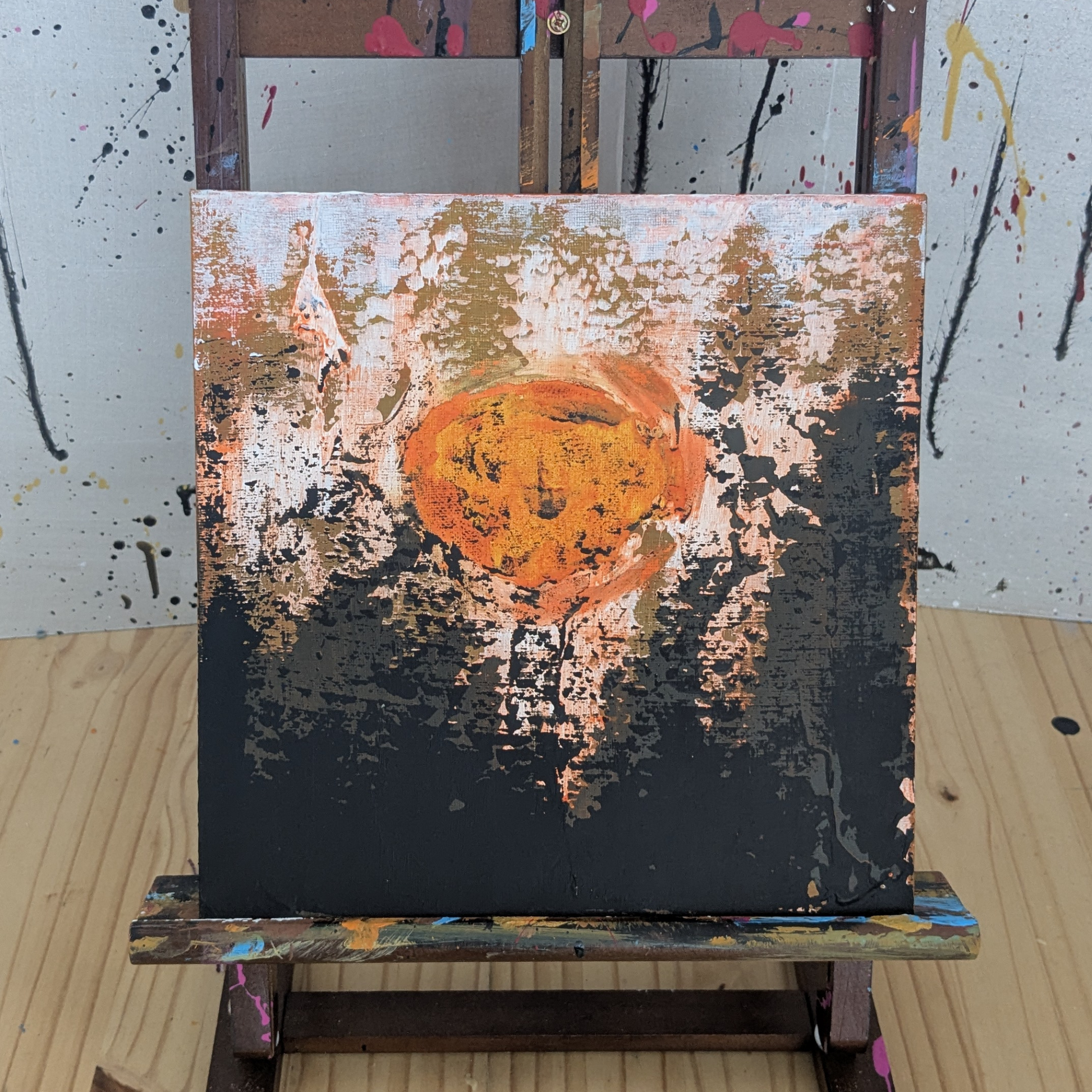 "Coucher de soleil dans la montagne" est une peinture acrylique abstraite originale, sur un carton entoilé au format 25x25cm (année 2025).