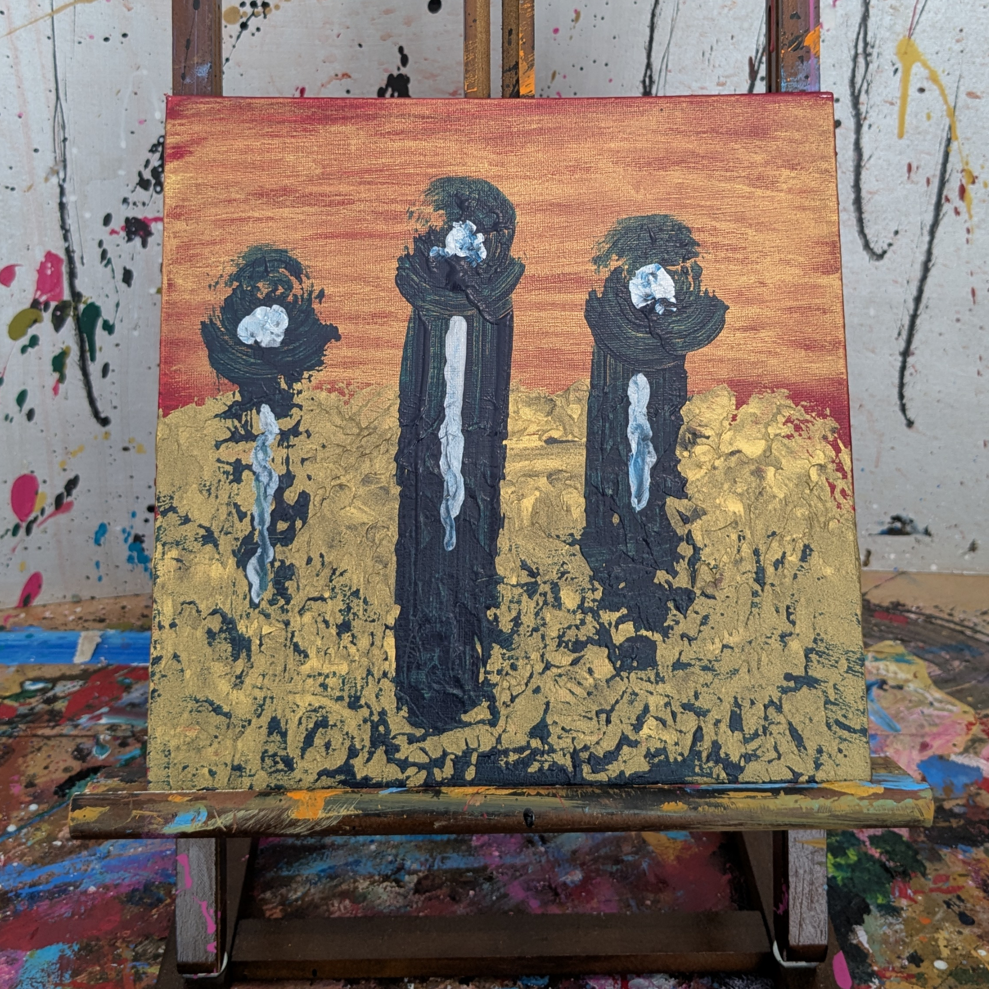 "Trois machines mystères" est une peinture acrylique abstraite originale, sur un carton entoilé au format 25x25cm (année 2025).