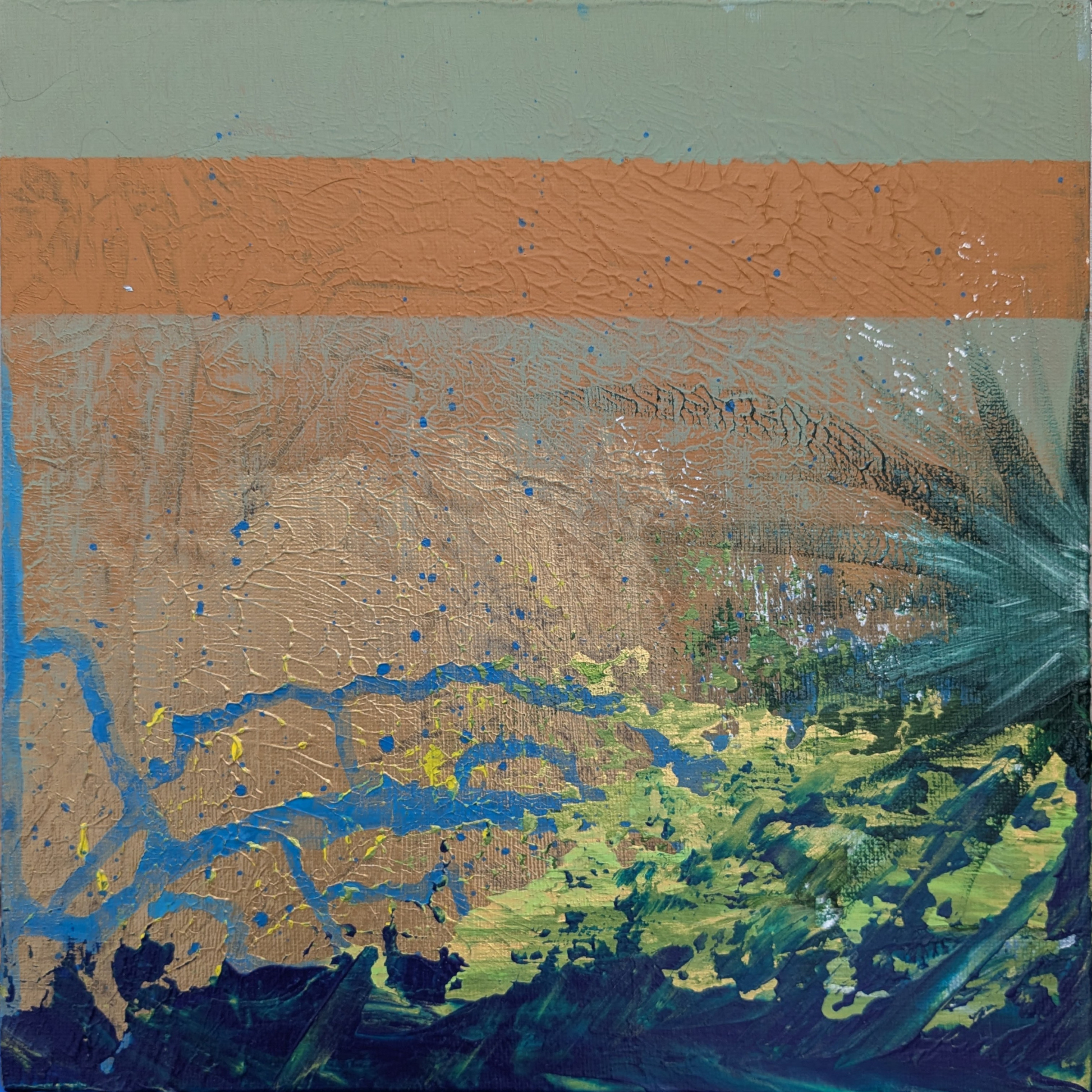 "Volcan vert" est un diptyque de peintures acryliques abstraites, sur des cartons entoilés au format 25x25cm (année 2025).