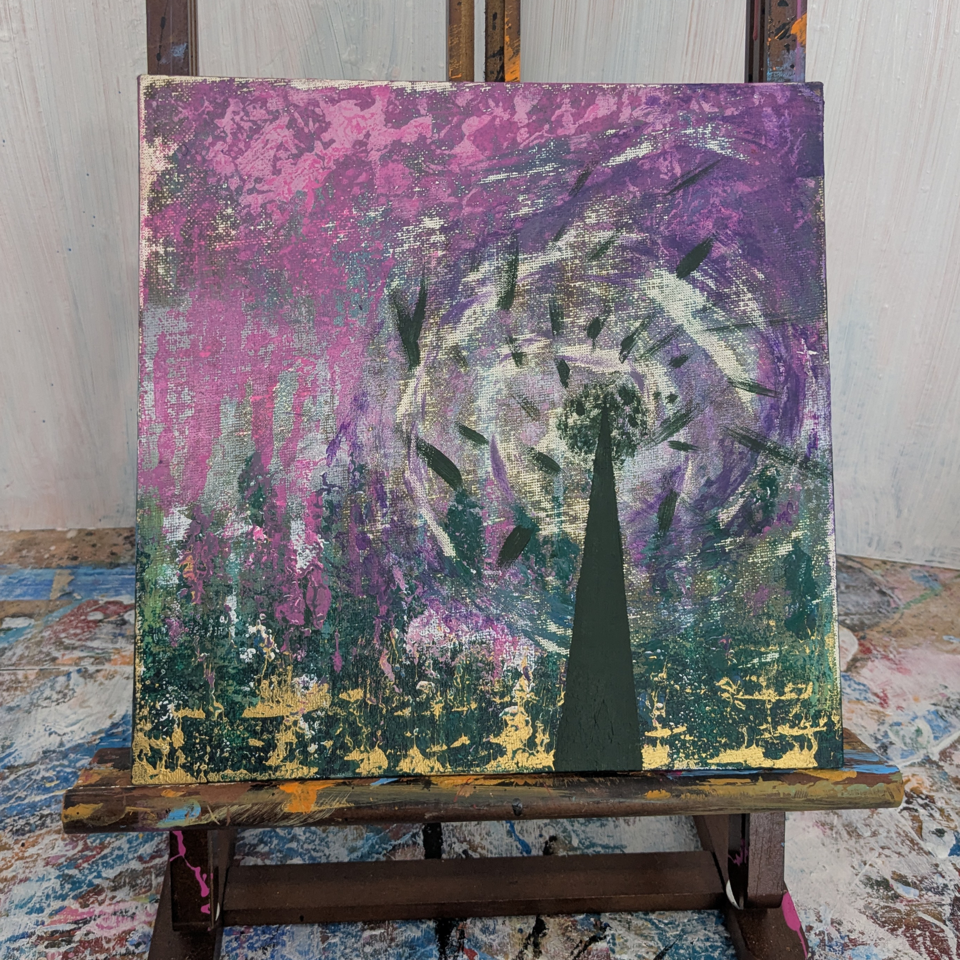 "Dispersion" est une peinture acrylique abstraite originale, sur un carton entoilé au format 25x25cm (année 2025).