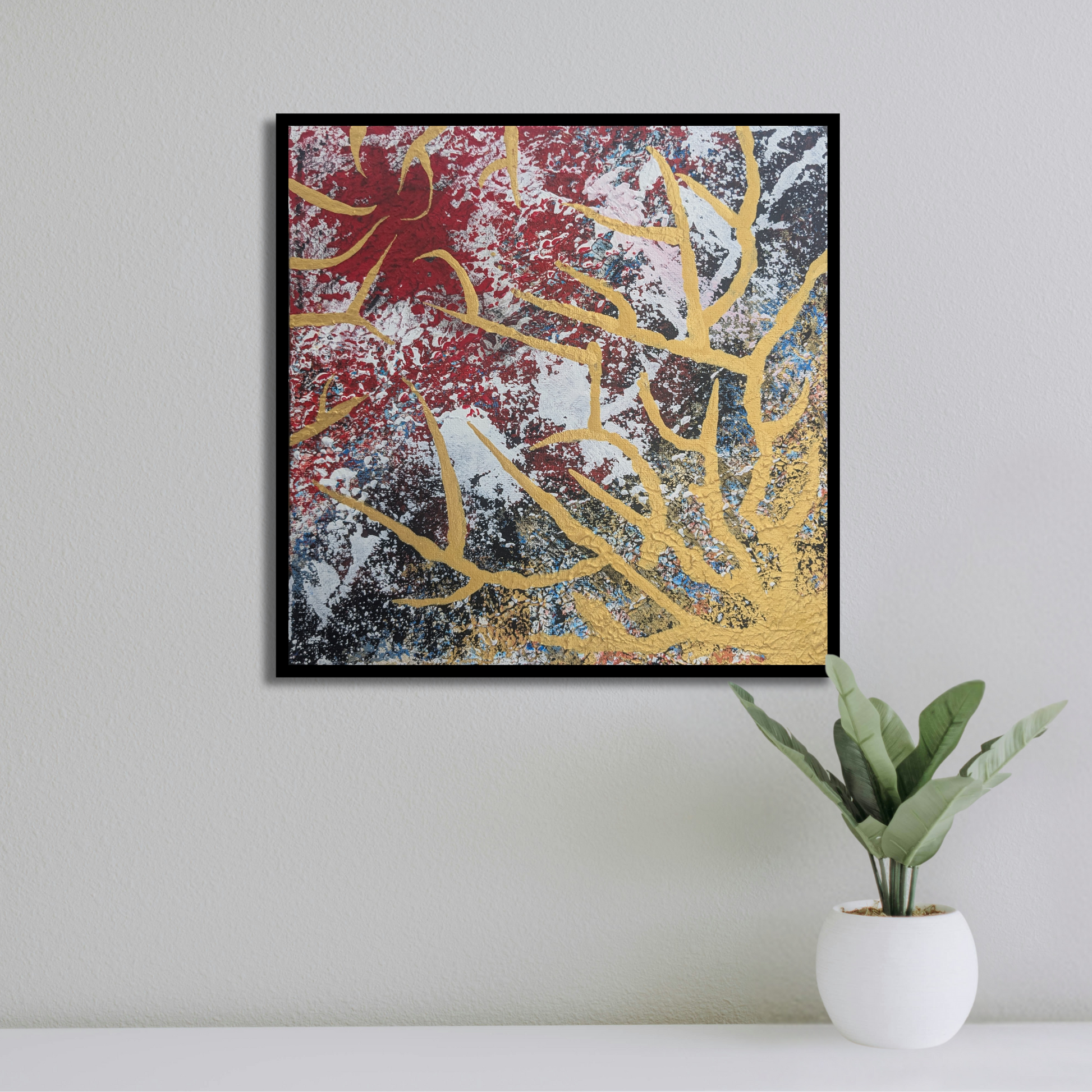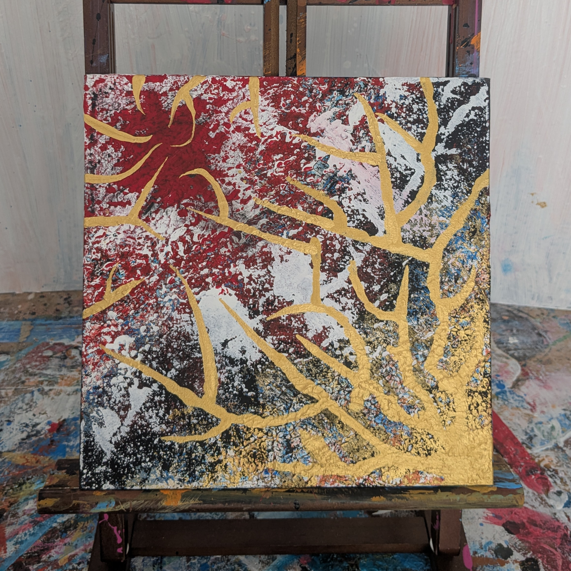 "Epineuse traversée" est une peinture acrylique abstraite originale, sur un carton entoilé au format 25x25cm (année 2025).